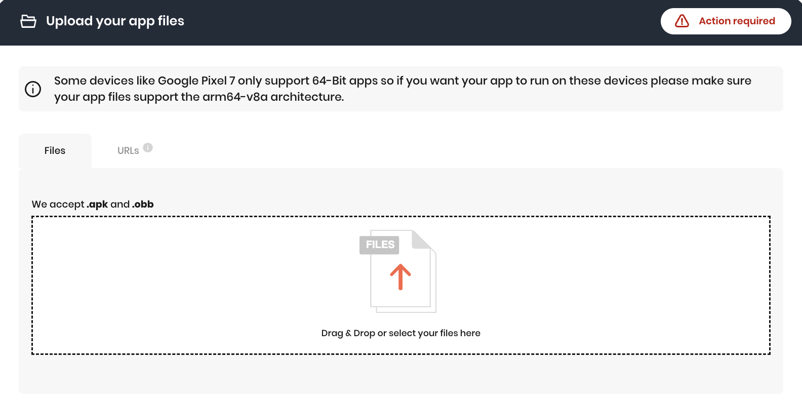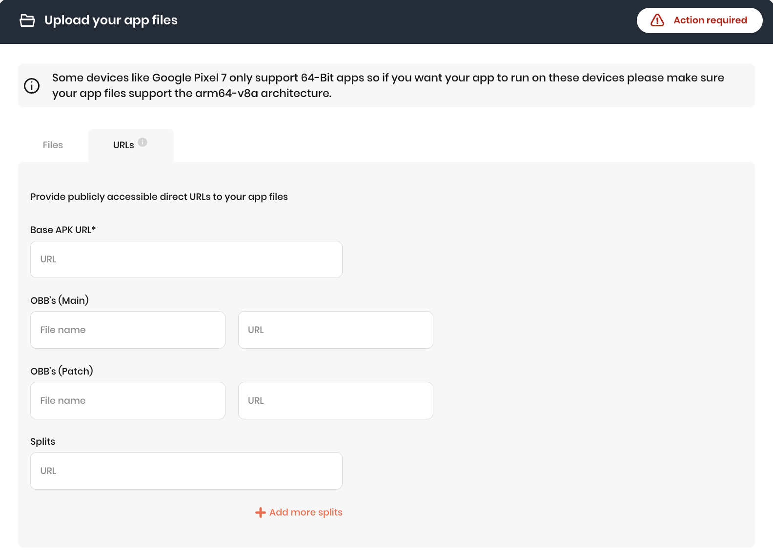 If you experience issues uploading files directly, you can alternatively provide publicly accessible direct URLs to your app files via the URLs tab.