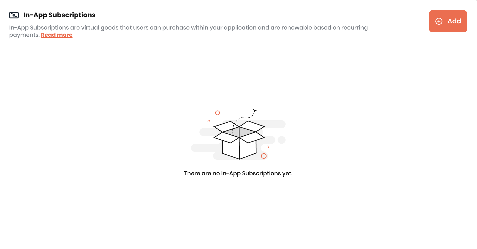 To access the In-App Subscriptions section, go to Apps, click on the app you want to manage, and the go to the In-App Subscriptions tab.