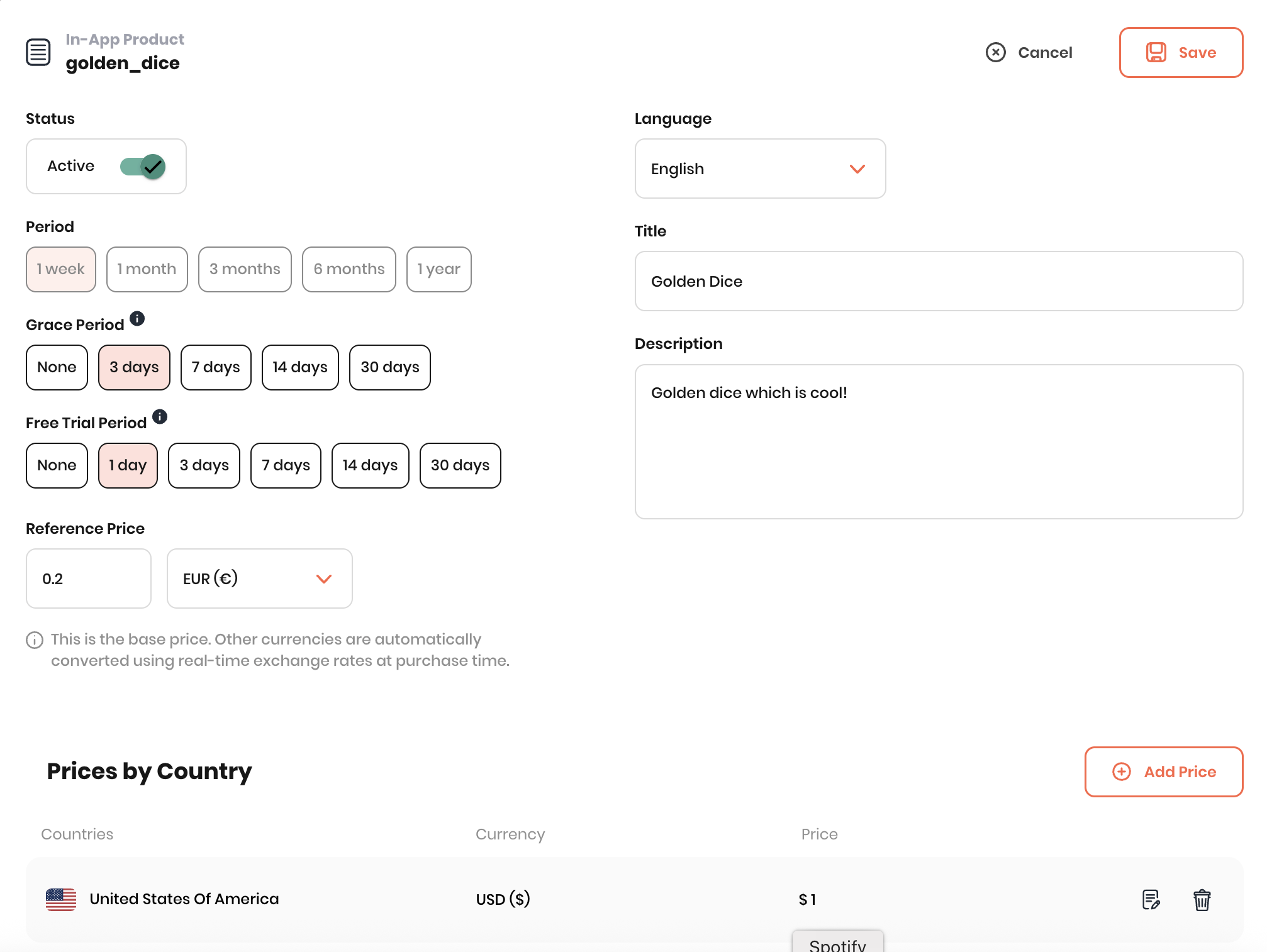 When editing an in-app subscription, you can update the Status, Grace Period, Free Trial Period, Title, and Description in multiple languages, set the Reference Price, and manage Country-Specific Prices.